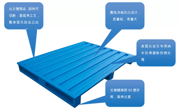 通過生產(chǎn)環(huán)節(jié)對鋼托盤表面處理工藝,有效的對鋼托盤進(jìn)行了防滑處理,真正解決了大量空托盤在自動化立體庫輸送中,因表面光滑導(dǎo)致空盤碼垛運行的錯位問題。