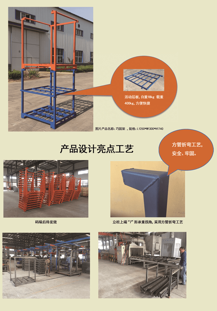 巧固架 產品特點:底部碼垛角鐵成80°設計促使碼垛的巧固架越壓越緊。