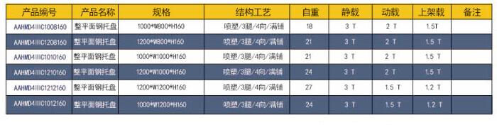 四向三腿——整平面鋼托盤 技術(shù)參數(shù)說明: 產(chǎn)品編號: AAHMD4ⅢH1210160 產(chǎn)品名稱: 整平板川字鋼托盤 產(chǎn)品規(guī)格: 1200*1000*160 產(chǎn)品重量: 24kg 產(chǎn)品靜載: 4000KG(均勻載重) 產(chǎn)品動載: 2000KG(均勻載重) 產(chǎn)品上架: 1500KG(均勻載重) 防銹工藝: 靜電沙紋噴塑 主要用途: 倉庫、車間周轉(zhuǎn)、物流倉儲